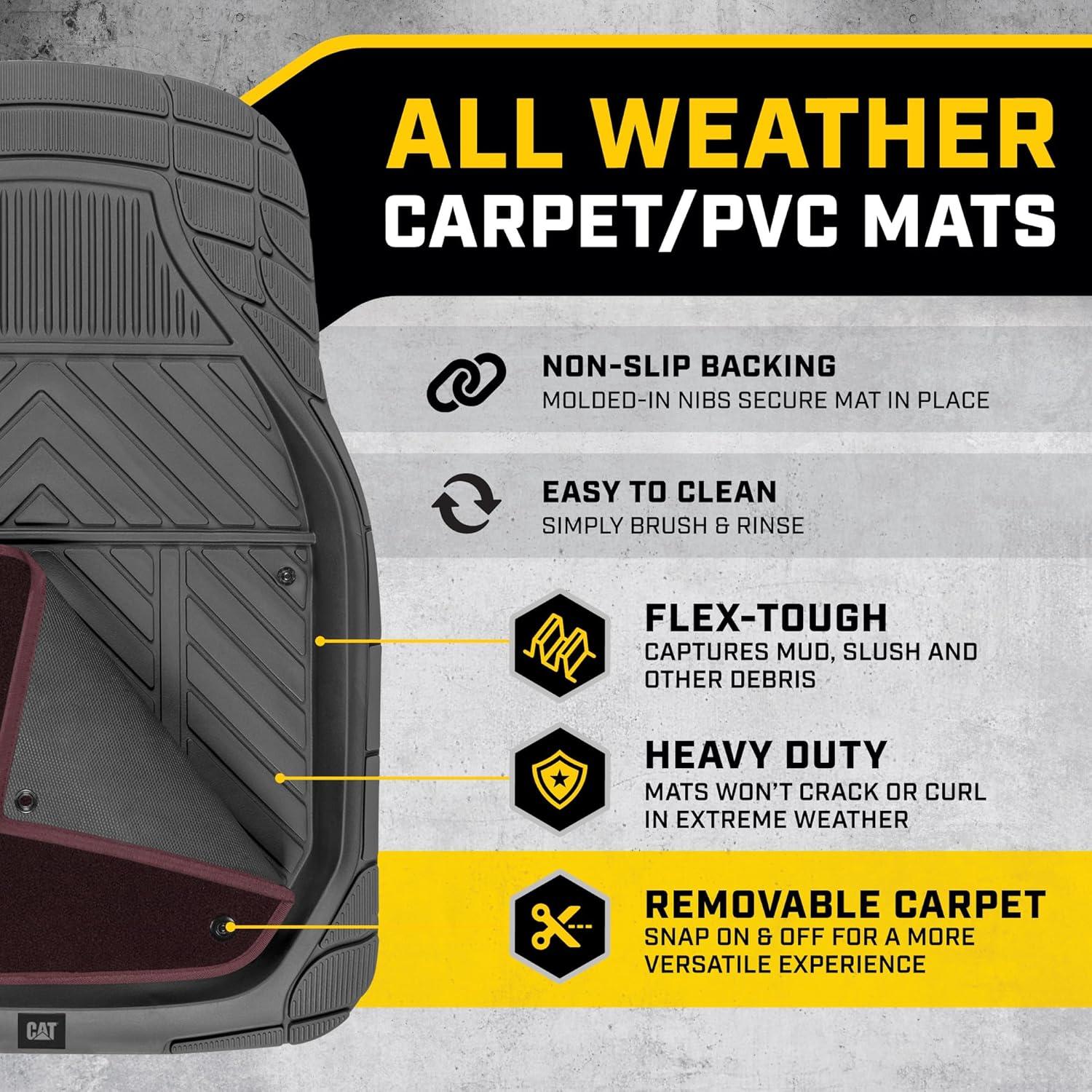 Upgrade your vehicle’s interior with the versatile and durable CAT® Detachable Deep Dish Car Floor Mats. Designed for SUVs, trucks, and sedans, these all-weather floor liners offer superior protection against dirt, mud, spills, and debris while delivering a customizable, comfortable driving experience. Featuring a unique removable carpet liner, these mats combine heavy-duty rubber construction with the soft, cushioned feel of carpet for added comfort and convenience.